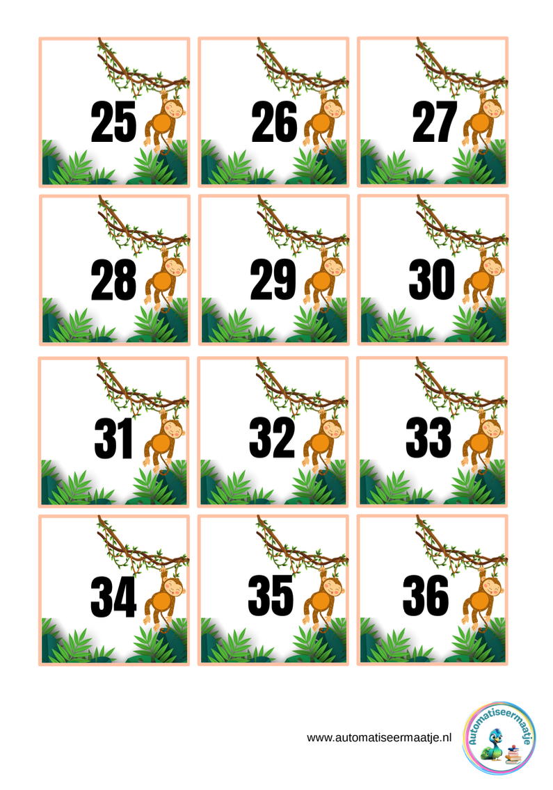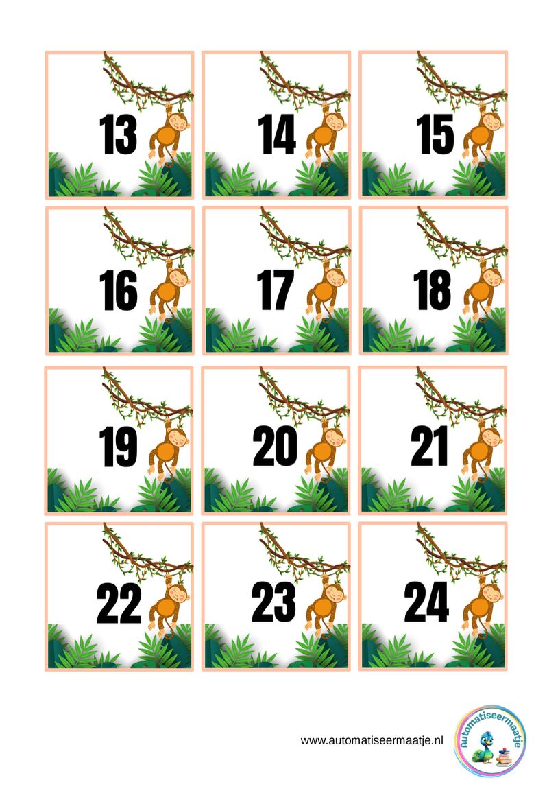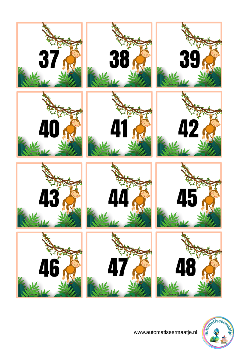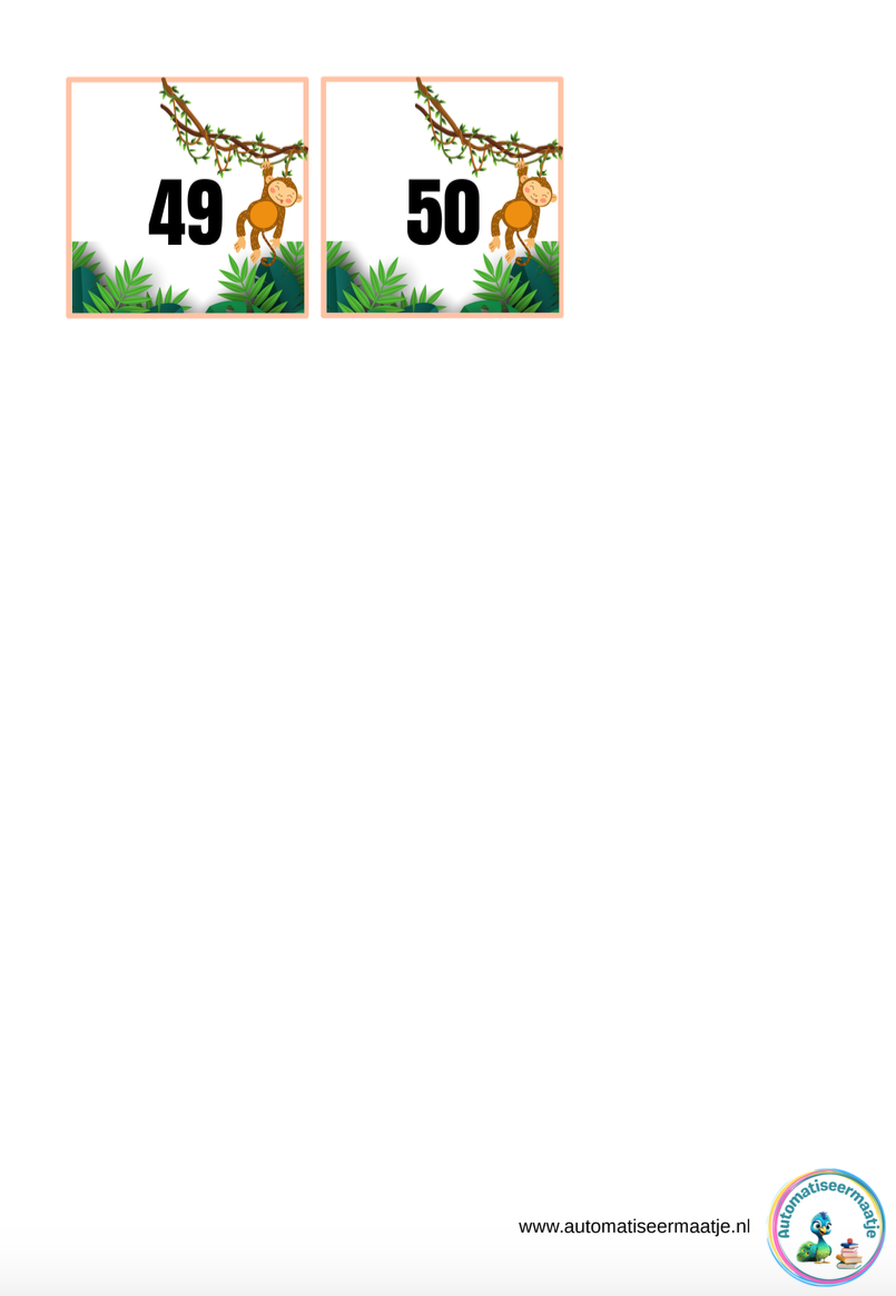 Download hier de cijferkaartjes 1 tot en met 50 in het thema jungle.